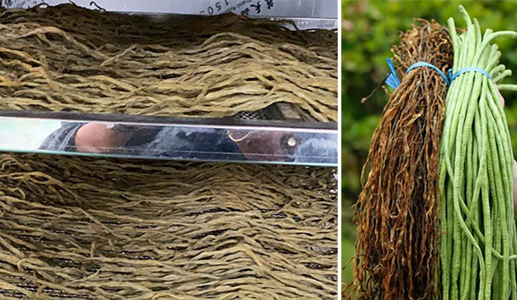 2.用滾燙熱水將豆角進(jìn)行殺青護(hù)色,水煮之后將撈出的豆角放進(jìn)冷水中進(jìn)行冷卻,之后撈起干水;