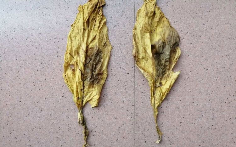 現(xiàn)象:烤制出的煙葉部分呈黑褐色,油分差,單葉重較輕,品質(zhì)低劣,幾乎無使用價值。